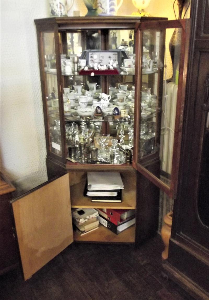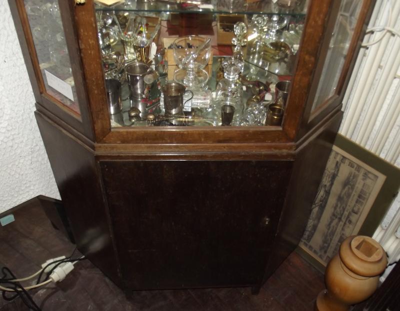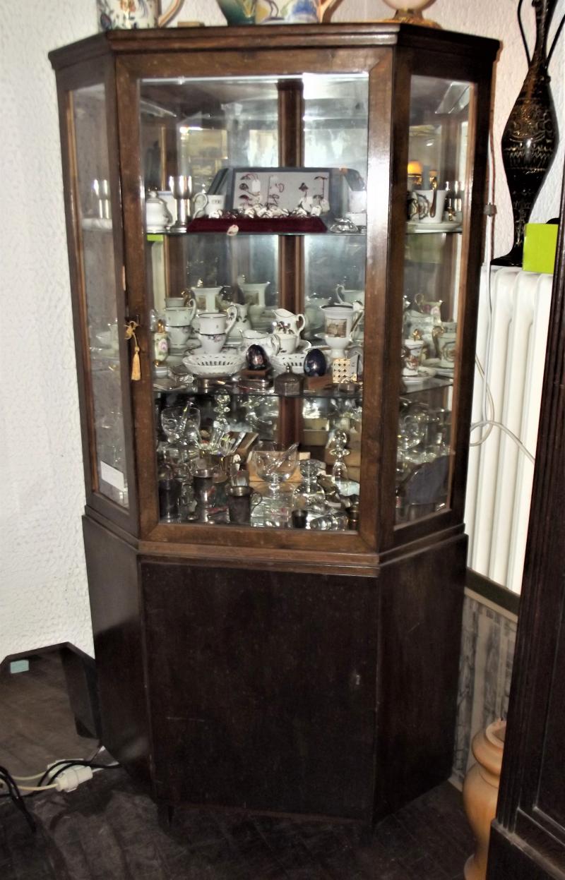 Alter Eckschrank, wohl aus den 1930er/40er Jahren Verkröpfter Korpus. Das Oberteil hat 3 heile Glasflächen, eine abschließbare Tür, 2 Glaseinlegeböden und eine nachträglich eingebaute Beleuchtung. Das Unterteil hat eine geschlossene Tür und einen Einlegeboden. Das Möbel ist größtenteils in Eiche dunkel gearbeitet. Nachbearbeitungen sind zu empfehlen. 2 Schlösser, 2 Schlüsselbuchsen, ein Schlüssel vorhanden. Kein erkennbarer aktiver Wurm. Die verspiegelten Rückwandflächen haben leichte charmante Altersflecken. Dem Alter entsprechend auch weiterhin einsetzbarer Wohnungszustand. Für Perfektionisten sind Nachbearbeitungen nötig. Höhe 161 cm, Schenkelmaß 57 cm, Türbreite oben und unten 46 cm Fotos sind Bestandteil der Beschreibung. Ungeschönter Fundzustand. Eine Lieferung ist eventuell möglich. Bei Anfrage bitte unbedingt Ihre PLZ angeben. Falls Sie noch Fragen zu diesem Artikel haben rufen Sie uns gerne an