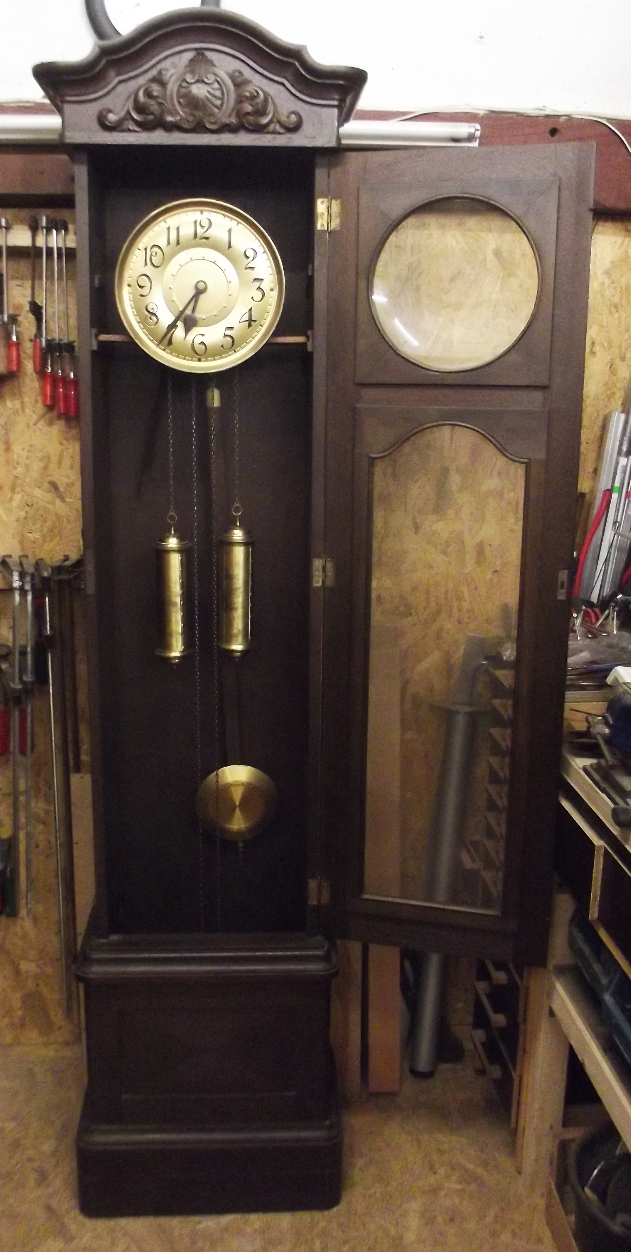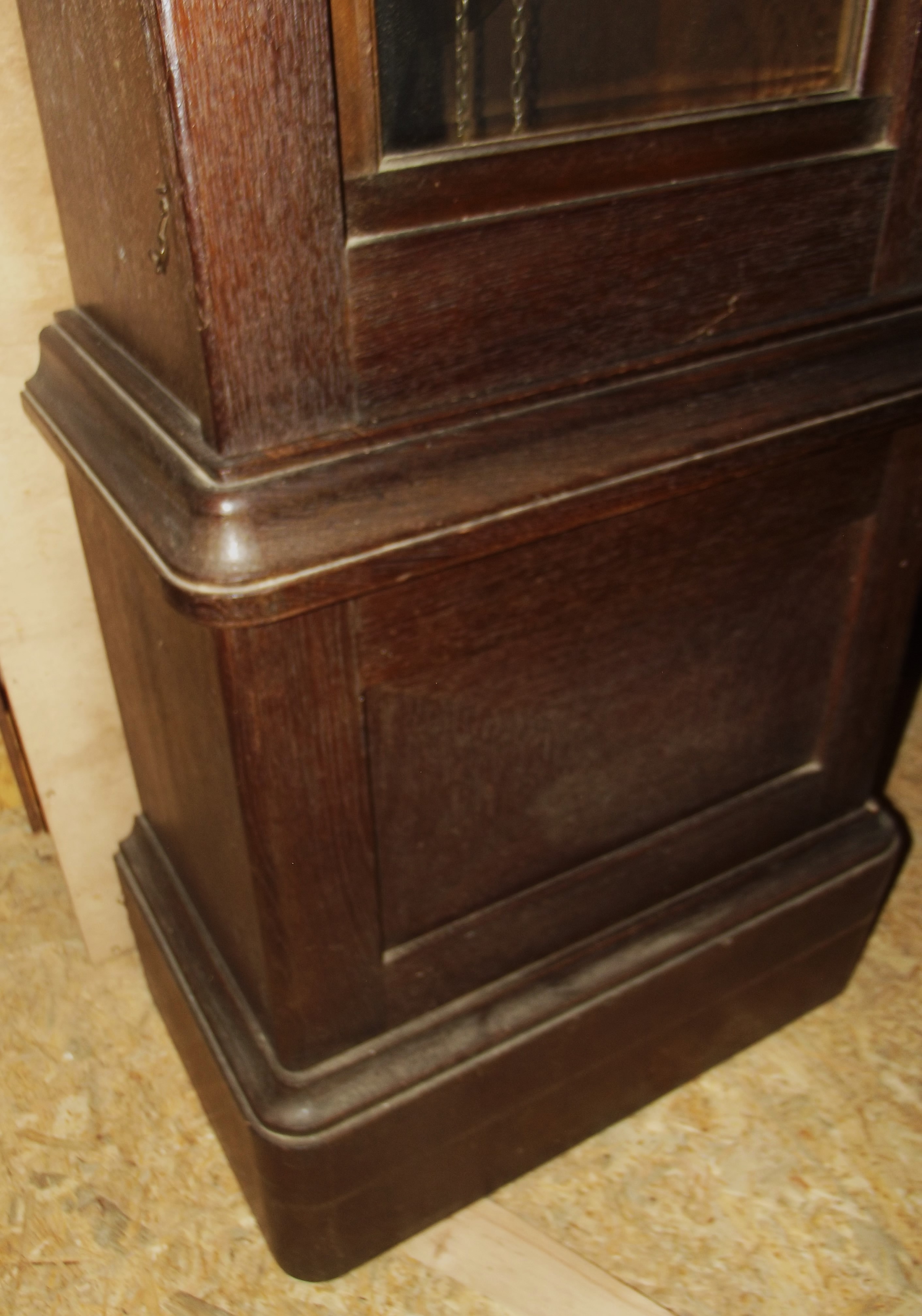 Antike Standuhr, wohl um 1920 Eiche, geschweifter, profilierter Kopf mit Schnitzwerk. Die große Facettschliffscheibe hat keine Schäden, ebenso das gebauchte Zifferblattglas. Der Korpus hat keine nennenswerten Schäden. Alte Schellackmattierung. Kein erkennbarer aktiver Wurm. Im Oberteil rechts und links 2 zu öffnende Klappen. Das kräftige Werk ( Vollplatine) läuft und schlägt, Kettenaufzug. Das Messingzifferblatt mit den originalen Zeigern hat keine Schäden. Originales Türschloss mit Schlüssel. Dem Alter entsprechend auch weiterhin sofortiger Wohnungseinsatz möglich. Höhe 215 cm, Breite am Kopfprofil 53 cm, Tiefe am Kopfprofil 30 cm, Korpusbreite 42 cm, Korpustiefe 25 cm, Breite am Sockel 51 cm, Tiefe am Sockel 30 cm Unberührter Fundzustand. Fotos sind Bestandteil der Beschreibung. Weitere Standuhren Uhren und andere Uhren finden Sie ebenfalls in unserem Shop. Eine Lieferung ist eventuell möglich. Bei Anfrage bitte PLZ mitteilen. Falls Sie noch Fragen zu diesem Artikel haben rufen Sie uns gerne an