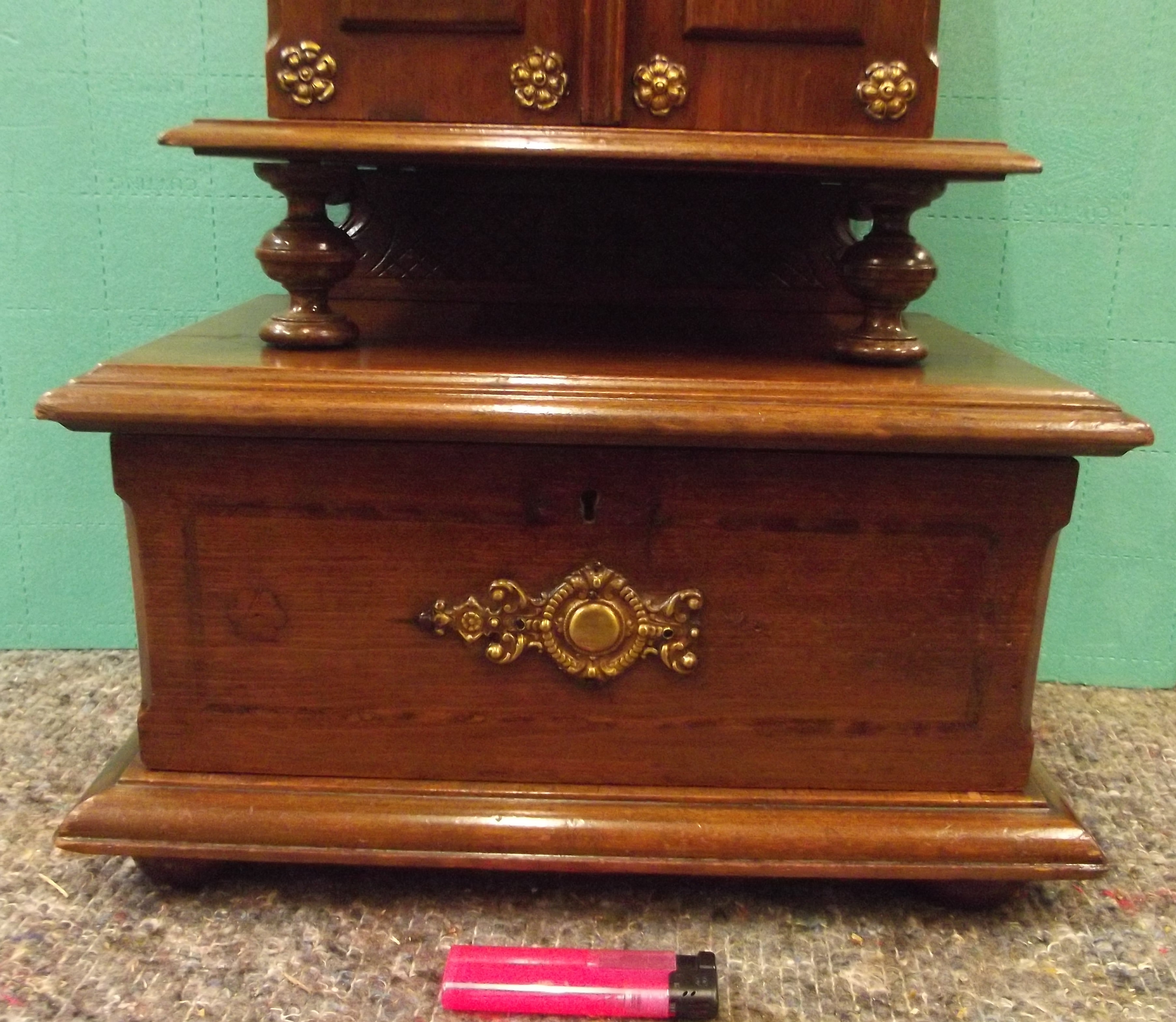 Ausgefallenes Modellmöbel aus der Gründerzeit Massivholz, wohl um 1890 gefertigt. Feine Drechselarbeiten, sehr aufwendige Applikationen ( geprägtes, gestanztes Messingblech) mit Patina. 2 originale Schlösser vorhanden. Alte Schellackmattierung mit Patina. 4 gedrechselte Füßchen, Muschelkrone. Die Türscharniere funktionieren gut. Der Schubkasten im Unterteil ist leicht gängig. Einige wenige Wurmlöcher ( innen, unsichtbar) sind von altem inaktivem Wurm, zu erwähnen, nicht sichtbar. Ein Originalmodell wohl um 1890 in Gründerzeit Stil. Keine Reproduktion. Höhe 48 cm, mit Muschelkrone 58 cm, Breite unten Sockelprofil 33,5 cm, Breite Kopfprofil 27 cm, Tiefe Sockelprofil 20 cm, Tiefe Kopfprofil 17 cm Versand 12 EUR Falls Sie noch Fragen zu diesem Artikel haben rufen Sie uns gerne an.