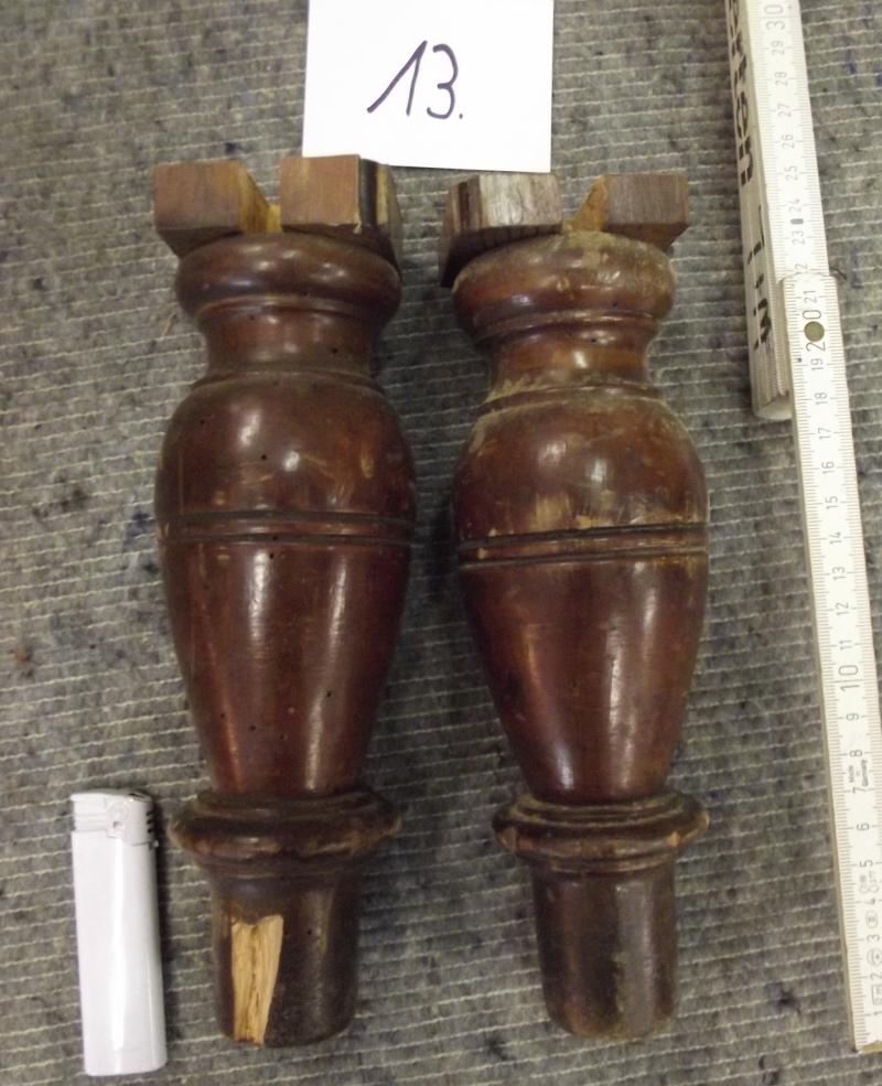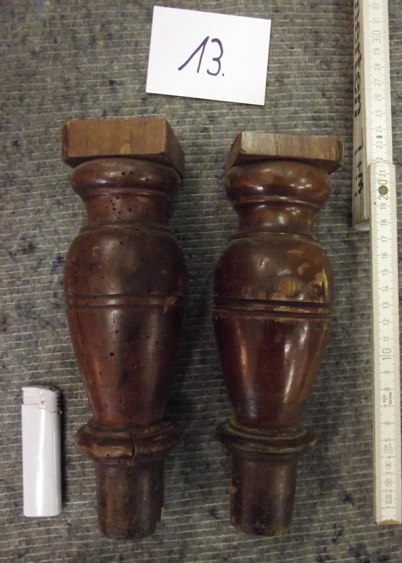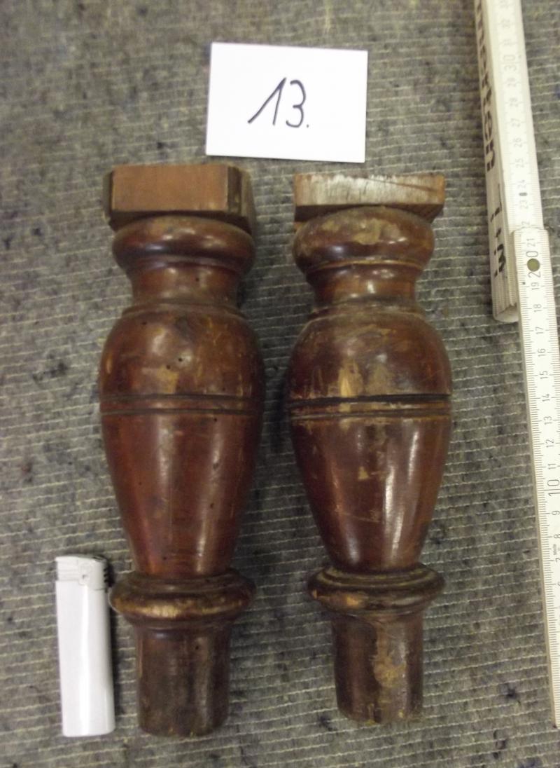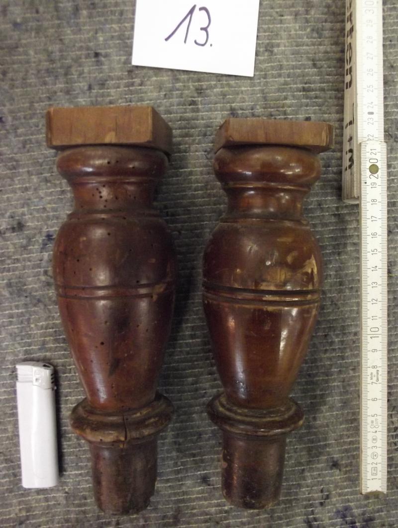 Paar Möbelbeine Nr. 13, um 1900 Dunkel gebeiztes Massivholz mit einigen alten Löchern von inaktivem Holzwurm. Alte Oberfläche Fotos sind Bestandteil der Beschreibung. Ungeschönter Fundzustand. Weitere Möbelholzteile, Beschläge und Schlösser für Restaurierungszwecks finden Sie ebenfalls in unserer Homepage. Länge im gedrechselten Bereich 21 cm, Gesamtlänge ca. 22,5 cm, Durchmesser 6,8 cm, Durchmesser unten 3,5 cm Versand 8 EUR Falls Sie noch Fragen zu diesem Artikel haben rufen Sie uns gerne an Bitte beachten Sie auch die anderen Artikel in unserer Homepage.